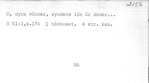 //// / J A //// O, dyre vänner, syndens lön är döden... //// i //// B 51:2,s.176 I bönhuset. 4 str. kom. //// a //// RA ////