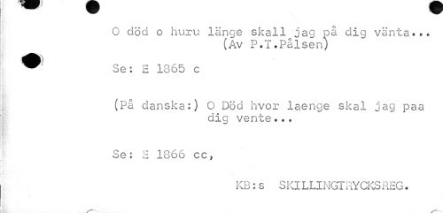 //// O död o huru länge skall jag på dig vänta... //// (Av P.T.Pålsen) //// Se: B 1865 c //// (På danska:) 0 Död hvor laenge skal jag paa //// dig vente... //// Se: E 1866 cc, //// KB:s SKlLLINGTRYCKSREG. ////