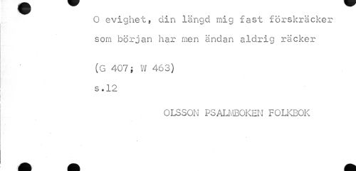 //// O evighet, din längd mig fast förskräcker som början har men ändan aldrig räcker //// (G 407; W 463) s .12 //// OLSSON PSALMBOKEN FOLKBOK //// % //// * ////