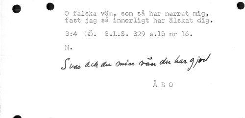 //// O falska värn, sorn så har narrat mig, fast jag så innerligt har älskat dig. //// 3:4 BO. S.L.S. 329 s.15 nr 16. N. //// ÅBO ////