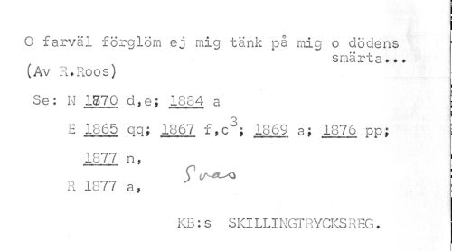 //// O farväl förglöm ej mig tänk på mig o dödens //// smärta.*. //// (Av R.Roos) //// ! //// Se: N 1870 d,e; 1884 a //// E 1865 qq; 1867 f,c3; 1869 a; 1876 pp; //// 1877 n, R 1877 a, //// KB:S SKILLINGTRYCKSREG. ////