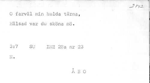 //// -J ) V-2 //// v. • //// O farväl min hulda tärna, Hälsad var du sköna mö. //// 3:7 SU IME 28a nr 23 N. //// ÅBO ////