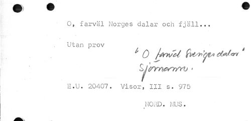 //// 9 * * //// O, farväl Norges dalar och fjäll... //// « //// Utan prov //// S> ] rmcvTYYV ' //// E.U. 20407. Visor, III s. 975 //// NORD. MUS. //// i ////