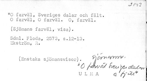 //// ... //// nQ farväl, Sveriges dalar och fält. O farväl, O farväl. O, farväl. //// i //// (Sjömans farväl, visa)• //// Sdml. Flöda, 2573, s.12-13. Ekström, R. //// i //// (Enstaka sjömansvisor). 9\&r**nnrrv> //// 4 6 fat* fe //// U L M A <a Q * ////
