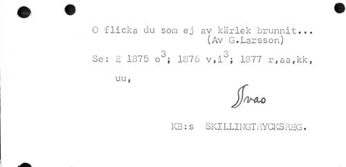 //// O flicka du som ej av kärlek brunnit.*. //// (Av G.Larsson) //// Se: E 1875 o^5; 1876 v,i°; 1877 r,aa,kk, //// uu, //// jfrtMUQ //// KB: s S Kl L LI NGT RYCKS EEG. ////