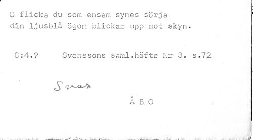 //// O flicka du som ensam synes sörja //// din ljusblå ögon blickar upp mot skyn. //// « //// 8:4.? Svenssons saml.häfte Nr 3. s.72 //// S //// ÅBO //// . _ , . .. . , ... ... J ////