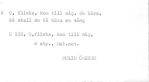 //// ä Of flicka, kom till mig, du kära, Så skall du få höra en sång //// B 122, O,flicka, kom till mig, //// 4 str., Mel.not. //// MOLIN ÖREBRO //// j //// i i //// ' N • • I ////