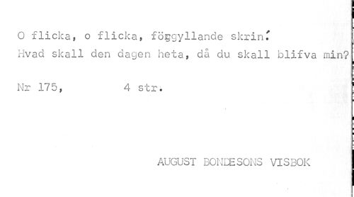 //// A //// O flicka, o flicka, förgyllande skrin. //// Hvad skall den dagen heta, då du skall blifva rain? //// Nr 175, 4 str. ! //// ¦ //// i ¦ //// ¦ //// august bondesons visbok i ////