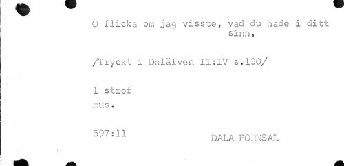 //// wm — //// 1 ¦ //// G flicka om jag visste, vad du hade i ditt //// sinn, //// /Tryckt i Dalälven II:IV s.130/ //// i //// 1 strof //// mus« //// 597:11 dala fornsal ////
