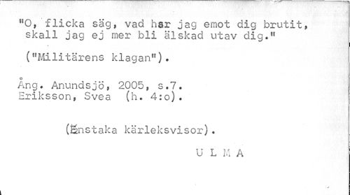 //// "O, flicka säg, vad har jag emot dig brutit, skall jag ej mer bli älskad utav dig." //// ("Militärens klagan"). //// > //// o //// Ang. Anundsjö, 2005, s.7. Eriksson, Svea (h. 4:o). //// (Snstaka kärleksvisor). //// U L m A ////