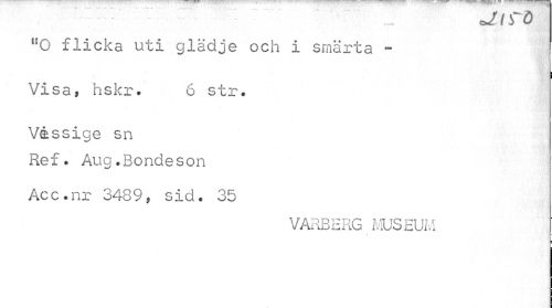 //// un oj //// tr0 flicka uti glädje och i smärta - //// i //// Visa, hskr. 6 str. //// Véssige sn Ref. Aug.Bondeson //// Acc.nr 3489, sid. 35 //// VARBERG MUSEUM //// ¦ ////