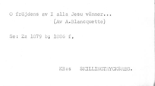 //// O fröjdens av 1 alla Jesu vänner... //// (Av A.Blancquette) //// Se: Zz 1379 b; 1886 f, //// KB:s SKILLINGTRYCKSREG. ////