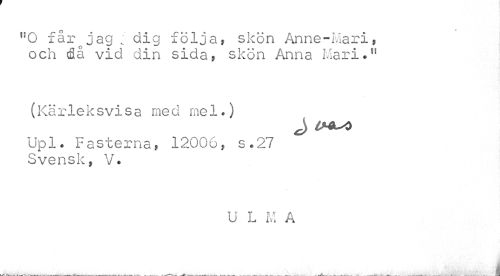 //// fl0 fårc jag : dig följa, skön Anne-Mari, och då vid din sida, skön Anna Mari*11 //// (Kärleksvisa med mel.) //// J o //// Upl. Fasterna, 12006, s.27 Svensk, V. //// U L M A //// i //// VY.---jfrw*..---.w^,-*-..^.,-.^*^--- v_, ---__---„---.--___ _ _ VW-.. ___>_ . ___ ////