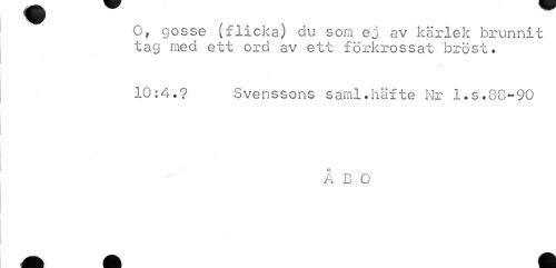 //// O, gosse (flicka) du som ej av kärlek brunnit tag med ett ord av ett förkrossat bröst. //// 10:4.? Svenssons saml.häfte Nr l.s.88-90 //// ÅBO ////