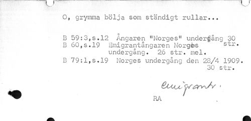 //// O, grymma bölja som ständigt rullar».. //// B 59:3,s. 12 Ångaren "Norges11 underfång 30 B 60,s.l9 Emigrantångaren Norgfes str. //// undergång. 26 str. mel. //// B 79:1,s.19 Norges undergång den 28/4 1909. //// 30 str. ////