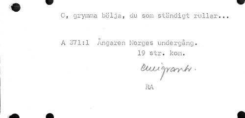 //// G, grymma bölja, du som ständigt rullar... //// r //// C 0 //// A 371:1 Ångaren Norges undergång. //// 19 str. kora. //// RA //// ^Él ^ m m. ////