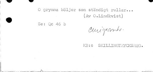 //// O grymma böljor som ständigt rullar... //// • (Av O.Lindkvist) //// Se: Qc 46 b ^ ^ ^ ^ //// KB:s SKILLINGTRYCKSREG. //// k //// S ^WÄ^JW _ .. ... ////