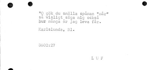 //// "O gök du snälla spåman "mår" så visligt säga mig också ljur många år jag leva får. //// Karlslunda, Bl. 3602:27 //// LUF ////