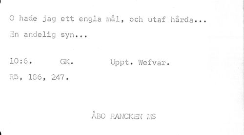 //// O hade jag ett engla mål, och utaf hårda... En andelig syn... //// 10:6. GK. Uppt. Wefvar. //// R5, 186, 247. //// ÅBO RANCKEN MS ////