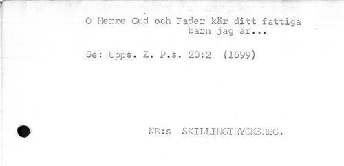 //// ¦ • //// O Herre Gud och Fader kär ditt fattiga //// barn jag är.•. //// Se: Upps. Z. P.s. 23:2 (1699) 0 KB:s SKILLINGTRYCKSREG. ////