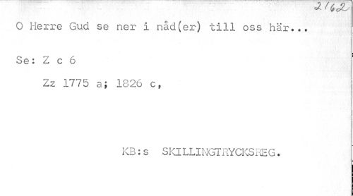 //// O Herre Gud se ner i nåd(er) till oss här... //// Se: Z c 6 //// Zz 1775 a; 1826 c, //// KB:s SKILLINGTRYCKSREG. ////
