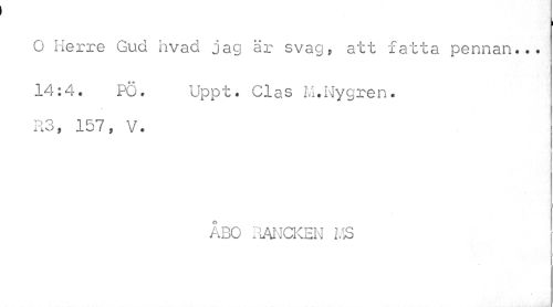 //// O Herre Gud hvad jag är svag, att fatta pennan... 14:4. PO. Uppt. Clas M.Nygren. //// Ro, ib 7, V. //// ÅBO RANCKEN MS ////