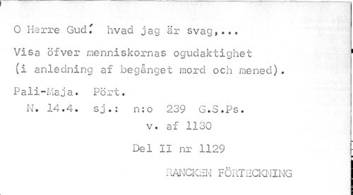 //// O Herre Gud' hvad jag är svag,... //// Visa öfver menniskornas ogudaktighet 1 //// (i anledning af begånget mord och mened). //// Pali-Maja. Port. //// N. 14.4. sj.: n:o 239 G.S.Ps. //// v. af 1130 //// Del II nr 1129 [ //// RANCKEN FÖRTECKNING ////