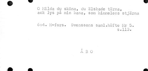 //// m\ //// O Hilda du sköna, du älskade tärna, //// ack lys på min bana, som himmelens stjärna //// 6:4. H-fors» Svenssons saml.häfte Nr 5. //// s.113. //// ÅBO //// A fc. ÉBk étk ////