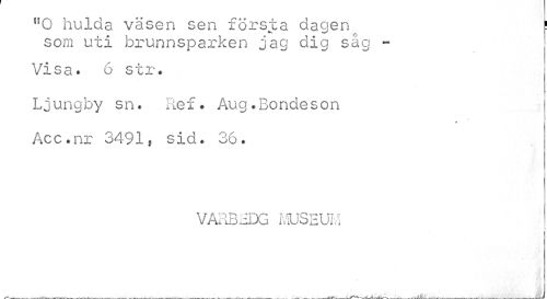 //// "O hulda väsen sen första dagen ! //// som uti brunnsparken jag dig såg - //// Visa. 6 str. //// Ljungby sn. Ref. Aug.Bondeson //// r //// Acc.nr 3491, sid. 36. //// VARBEDG MUSEUM //// : ////