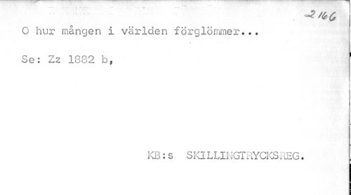 //// O hur mången i världen förglömmer... //// • • i //// Se: Zz 1882 b, 1 //// KB:s SKILLINGTRYCKSREG. . ////