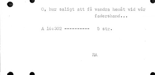 //// O, hur saligt att få vandra hemåt vid vår //// fadershand... //// A 16:302 ---5 str. //// 4 //// RA ////