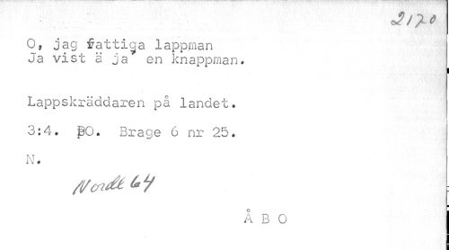 //// O, jag fattiga lappman Ja vist ä ja en knappman. //// Lappskräddaren på landet. //// i t //// 3:4. po. Brage 6 nr 25. N. //// ¦ //// ABO i ////