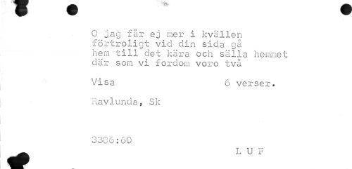 //// .i ^^^^^^ - 'fl fl b m b ^ hr //// Wmi ij^^^^r ¦ ^^^^ //// O jag får ej mer i kvällen förtroligt vid din sida gå hem till det kära och sälla hemmet där som vi fordom voro två //// Visa 6 verser. //// Ravlunda, Sk //// 3386:60 //// A L U F ////