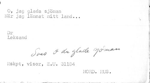 //// i //// O, jag glada sjöman Nar jag lämnat mitt land... //// Dr //// Leksand //// JU f^f*^ //// Mskpt, visor, H.U. 31184 //// NORD. MUS. //// •A, i '» « ' V ___ '---v,. ... ... . _ ? \' -f ' i ////