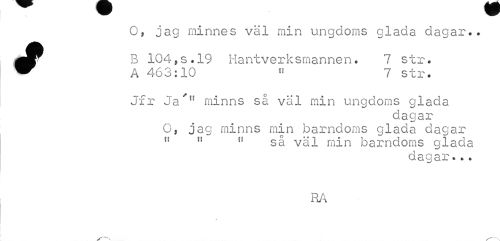 //// \ //// O, jag minnes väl min ungdoms glada dagar.» //// äj^r B 104,s. 19 Hantverksmannen. 7 str. //// ™ A 463:10 11 7 str. //// Jfr Ja't! minns så väl min ungdoms glada //// dagar //// O, jag minns min barndoms glada dagar ff ft u så väl min barndoms glada //// dagar*.? //// RA ////