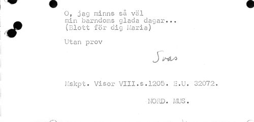 //// O, jag minns så väl Ä min barndoms glada dagar... //// JP (Blott för dig Maria) //// s)M m m ¦ //// Utan prov //// J StisO //// Mskpt. Visor VIII.s.1205. E.U. 32072. //// NORD. MUS. ////