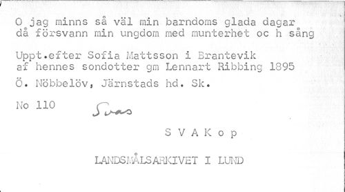 //// O jag minns så väl min barndoms glada dagar då försvann min ungdom med munterhet oc h sång //// Uppt.efter Sofia Mattsson i Brantevik af hennes sondotter gm Lennart Ribbing 1895 //// Ö. Nöbbelöv, Järnstads hd. Sk. No 110 C" //// / //// S V A K o p LMDSMÅLS ARKIVET I LUND ////