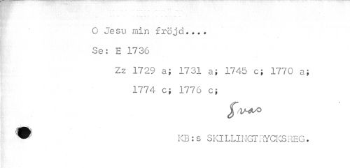 //// - //// O Jesu min fröjd... Se: E 1736 //// Zz 1729 a; 1731 a; 1745 c; 1770 a; 1774 c; 1776 c; //// •'• ééi hl //// ™ KB: s S Kl L LI NGT RYCICS REG. ////
