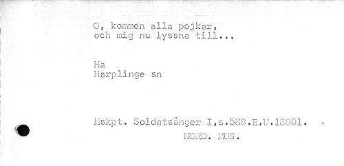 //// ... ... //// O, kommen alla pojkar, och mig nu lyssna till... //// Ha //// Harplinge sn //// ^ Mskpt. Soldatsånger I,s.588.E.U.18801. //// ™ NORD. I,US. ////