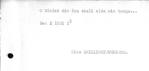 //// O kärlek din-ära skall elda min tunga... //// I v*1 //// Se: E 1831 l2 //// • KB:s SKILLINGTRYCKSREG. ////