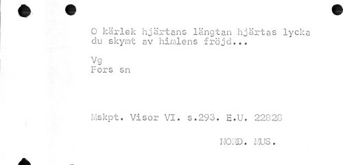 //// O kärlek hjärtans längtan hjärtas lycka du skymt av himlens fröjd... //// Vg //// Fors sn //// Mskpt. Visor VI. s.293. E.U. 22828 //// NORD. MUS. ////