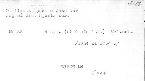 //// T f. ' " " «- J //// 0 lifsens ljus, o Jesu kär Jag pa ditt hjerta rör, //// ¦ ¦ //// Nr 88 4 str. (st 4 ofullst.) Mel.not. //// /Svas Zz 1764 a/ //// WIEDE MS ////