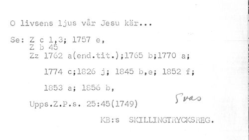 //// O livsens ljus vår Jesu kär... //// Se: 2 c 1,3; 1757 e, //// Z b 45 //// Zz 1762 a(end.tit.);1765 b;1770 a; 1774 c;1826 j; 1845 b,e; 1852 f; 1853 a; 1856 b, Upps.Z.P.s. 25:45(1749) j //// KB:s SKILLINGTRYCKS REG. ////