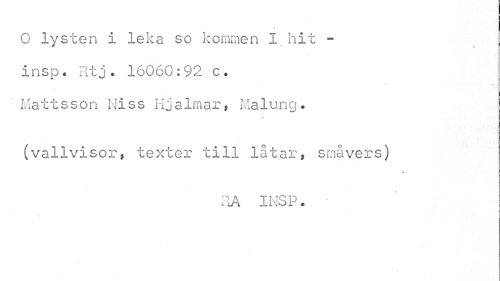 //// < //// O lysten i leka so kornmen I. hit - //// insp. Rtj. 16060:92 c. //// Mattsson Niss Hjalmar, Malung. //// % //// (vallvisor, texter till låtar, srnåvers) //// HA INSP. ////