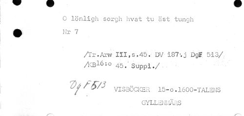//// 0 lönligh sorgh hvat tu äst tungh //// 1 //// /Tx.Arw III,s .45. DV 187-.j Dgff 513/. //// /KBl6^o 45/ suppi./ . . ' ' : ' //// Ojf ffr/i VIS BÖCKER 15-o .1600-TALENS //// GYLLENI.ÄRS ////