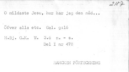 //// , - - - cx: /v //// O mildaste Jesu, hur. har jag den nåd... //// e //// Ofver alla etc. Gal. g:16 //// r //// H.Bj. G.K. W. 3.6 n. - s. //// Del I nr 478 //// RANCKEN FÖRTECKNING //// é ////