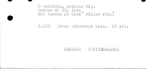 //// O Ivlenniska, besinna dig, //// Emedan du får leva ^ Att vandra på Guds' viljas stigf //// S.139 Johan Ericssons visa. 19 str. //// AXELSON VES TEHDALARNE //// k- K4 '^-nT ' ' ////