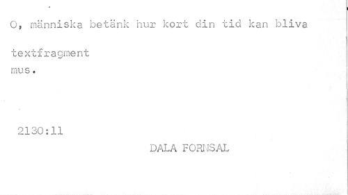//// O, människa betänk hur kort din tid kan bliva //// textfragment mu s. //// ! //// 2130:11 //// DALA FORNS AL ////