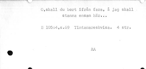 //// O,skall du bort ifrån fara, å jag skall //// stanna ensam här... //// B 105:4,s.69 Timtamareskvisa. 4 str. //// RA ////