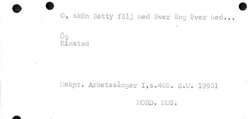//// O, skön Betty följ med över äng över hed... //// # //// dr //// o g //// Kimstad //// } //// * //// i //// * //// Mslcpt. Ar betssånger I.s.468. E.U. 19931 //// NORD. MUS. ////